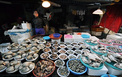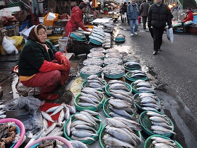 韓国ブサンの観光名所の一つとして、「ジャガルチ市場」があります。 「ジャガルチ市場」はブサンの代表的な在来市場で、「ジャガルチ」という 言葉は、当時「ジャガル」=「砂利」があった場所を「ジャガルチョ(処)」 と呼んだのが始まりだそうです。[百科事典から] 現在、「ジャガルチ市場」には480余りの店舗があり、主に沿岸や南海から 獲れる魚介類が多いそうですね。 新鮮で安い海産物を十分満喫できると思います~