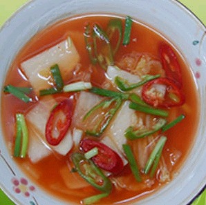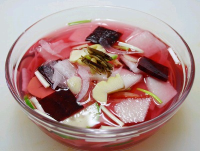 言葉通り、汁があるキムチで、大根水キムチ、せり水キムチ、