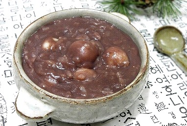 「パッジュク」は、あずきを茹でつぶして出した汁を使って作った 粥です。韓国では昔から冬至に食べる習慣があります。 あずき粥に小麦粉の団子を入れて食べるのは普通です。 赤いもので粥を作り、玄関のところにまけば、魔除けになるという 言い伝えがあります。病気や家庭の平安のために作り始めたと 思いますが、今は寒い冬によく思い出される料理になっています。 日本のお汁粉と良く似ています。 お汁粉と違うのは、甘さと、粥なのでご飯の粒が入っている点だと 思います。