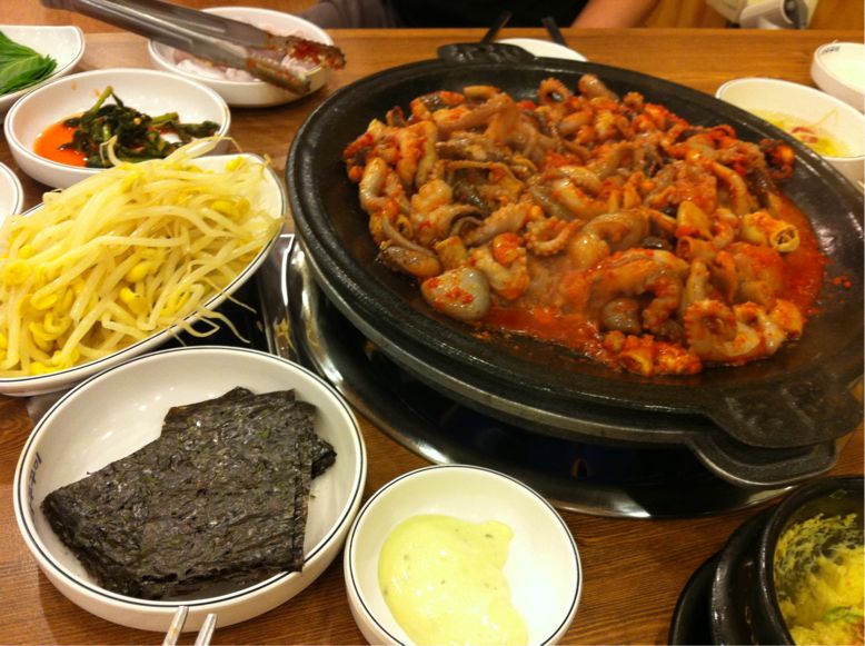 イイダコ炒めは昔からあった料理ですが、最近は辛さも激辛まで選択ができ、またイイダコ以外のホルモンや、豚肉などを副材料として入れて食べるようになっていました。私はホルモンを一緒に入れて食べました。(^_^)中にはジャガイモやお餅などが入っており、辛いイイダコを包んで食べれるように、マヨネーズ入りのワサビタレと海苔と甘酸っぱい大根とモヤシが一緒に出ました。辛いけど、美味しかったです。