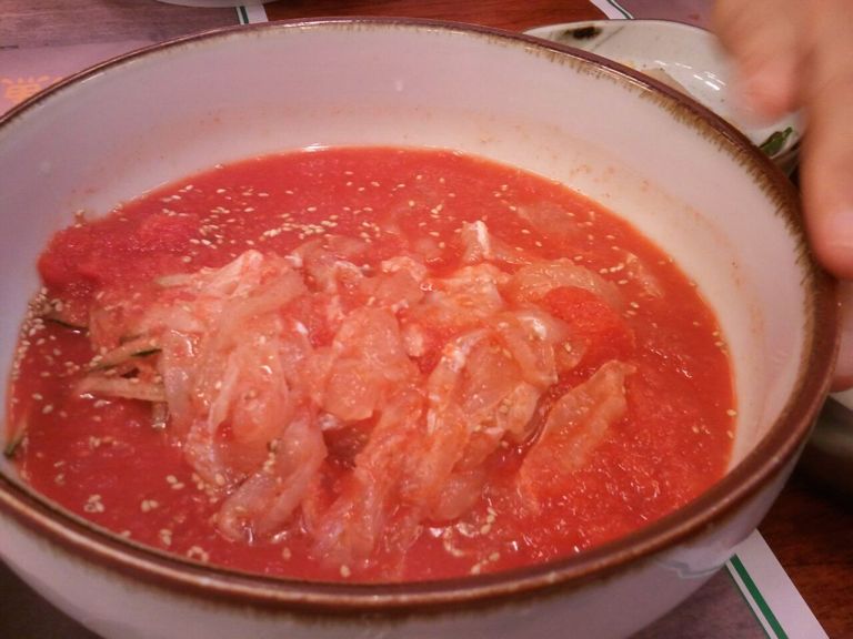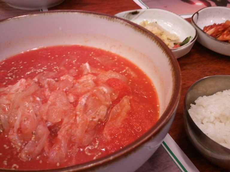 今回、韓国で美味しく食べた料理の中の一つがスープ刺身です。名前だけではイメージがピンとこない方が多くと思いますが、私も食べる前はそうだったんです。韓国語を直訳すると、お水刺身と意味です。刺身をメイン食材にして、野菜と梨なども入れ、ピリ辛の味付けで、白いご飯と一緒に食べます。冷たくて、夏に食べるには最高に美味しかったです。
